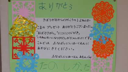 先月、1・2年生が近隣の幼稚園や保育園の子どもたちを招いて行った「ワクワクフェスティバル」。船橋西保育園の子どもたちからお礼の手紙が届いていました。1年生の教室の廊下に掲示してあります。