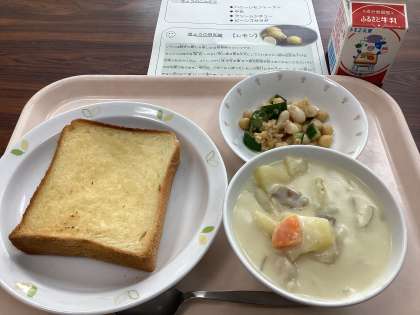 レモンは、酸味や香りを楽しめる柑橘類の一つです。カルシウムなどを吸収しやすい形に変え骨を丈夫にしてくれるクエン酸や、血圧を下げる効果のあるカリウム、ストレスから体を守る働きや疲労回復を助けるビタミンCなど、いろいろな効果があります。今日はバターに絞ったレモンの果汁とすり下ろしたレモンの皮とハチミツを合わせて、パンに塗りました。ほんのりとした酸味を味わってください。