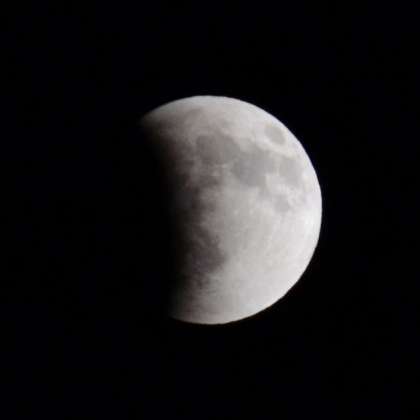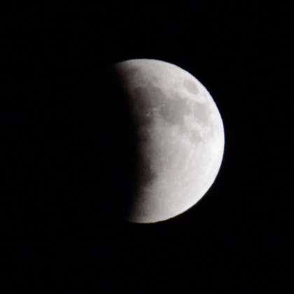 10日の夜は、日本全国で皆既月食を見ることができました。学校で子どもたちに担任を通して紹介しましたので、お子さんと一緒に観測した方も多いと思います。私も自宅でカメラに望遠レンズを装着して撮影しましたので紹介します。夜9時43分、左側から地球の影で欠け始めた月が、30分あまりたった10時17分頃には半分になりました。写真ではよく見えませんが、欠けて暗くなっている部分はいつもの半月よりほんのり赤く見えていました。