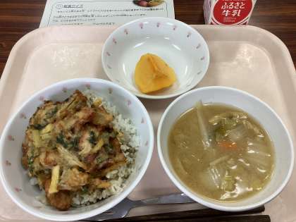 今日の果物は秋の味覚、柿です。柿には黒い模様があります。これは「タンニン」という渋みです。柿のタンニンは熟すとおいしく食べられるようになります。また柿には1日に必要なビタミンCが摂れるほどの果物です。「柿が赤くなれば、医者が青くなる」と言われるほど栄養たっぷりの果物です。おいしくいただきましょう。