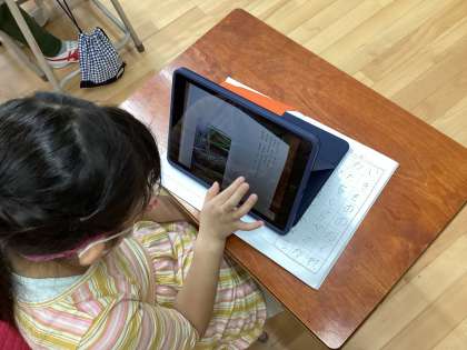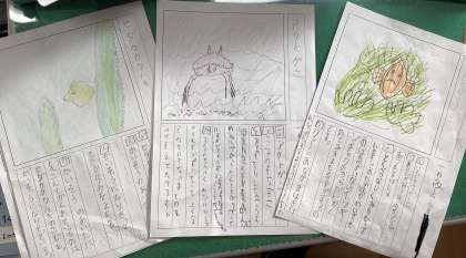 国語の学習では、「うみのかくれんぼ」という学習をしました。教科書に出てきた生き物以外に他の生き物の隠れ方を調べてカードにまとめました。タブレットを見てどんな生き物にしようか選び、選んだ生き物について、生き物の名前、場所、体のこと、隠れ方の4つを見付け、まとめました。この学習が終わると、国語の学習も下巻を使い学習します。