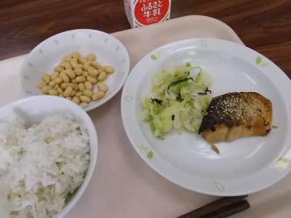 煮た豆のことを「ぶどう豆」といいます。今日は大豆に醤油と砂糖を入れて煮ました。煮ることで豆に色が付き、ふっくらと柔らかい状態に仕上がります。その様子がぶどうにに似ているため、ぶどう豆と呼ばれるのです。