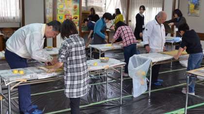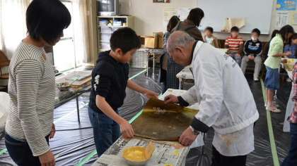 さあいよいよ染色の体験です。ランチルームに会場が準備され、2人の職人さんが手をとって指導してくださいました。和紙を重ねて柿渋をぬった細かい模様のはいった型紙を布の上に重ね、染料をへらで塗ってできあがりです。学習ボランティアの保護者の方が、布の準備や使い終わった型紙の拭き取りなどを手伝ってくださり、どの子もりっぱな作品に仕上がりました。