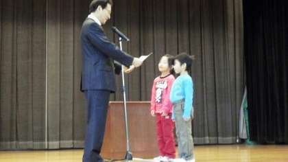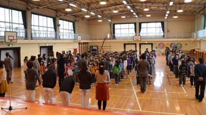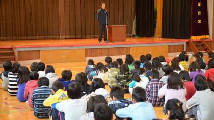続いて、冬休みの生活について、生活指導主任が話をしました。寒い体育館でしたが、みんな体育座りをして、姿勢良く聞くことができました。その後、2学期のエコ活動に協力した学級の表彰をして、終業式を終了しました。最後に職員と子どもが向かい合って、子どもたちが「ありがとうございました」のあいさつをしました。