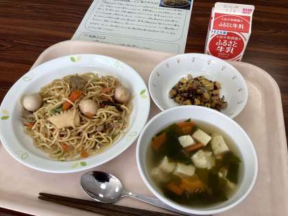上海焼きそばは、中国の上海ではポピュラーな焼きそばです。えびやいかなどの魚介類を入れ、中国の醤油で味付けしたものです。本場中国の醤油は老抽(ラオチョウ)といい、色が黒くて、甘い味がします。中国の醤油は手に入りにくいので、給食ではオイスターソースと醤油を使って味付けをしました。いつものソース焼きそばとはまた違った、あっさりとした味わいを楽しめると思います。給食の焼きそばは、一度にたくさんの量を作るので、全体に火が通るよう、先にスチームコンベクションオーブンで麺を加熱しておきます。そして、別に炒めておいた具と麺を、大きな釜で炒め合わせて作っています。