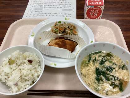 たれにすり下ろしたにんじんを加えることで、紅葉のようなきれいなオレンジ色に仕上がることから、「もみじ焼き」と名付けられました。今日はご飯にも秋が旬のさつまいもを入れて炊きあげました。季節が感じられる献立です。秋を味わってください。