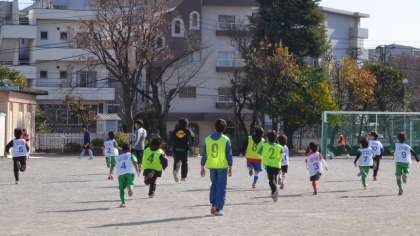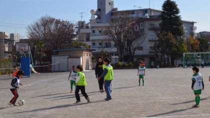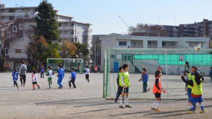 24日(土)、冬型の気圧配置になり日本全国冷え込んだ朝でしたが、東京は晴天。晴れわたた青空の下で、FCグリーンファイターズが校庭で練習に励んでいました。といっても、今日は低中高学年入り交じってのお楽しみ練習試合だそうで、いつもの練習風景とはちがう和気あいあいとした雰囲気でした。この後お楽しみ会を開くそうです。