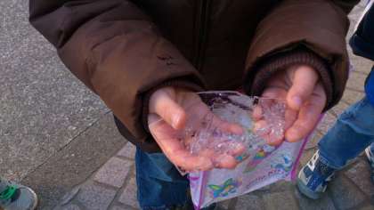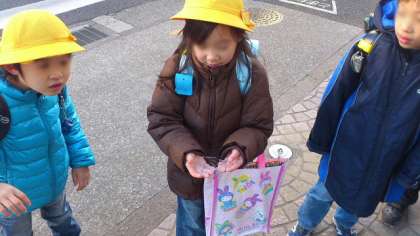 12日の朝はぐっと冷え込みました。登校してくる子供たちは寒そうに身を縮めています。道路の向こうで手に透明な物を大事そうに持っている子が・・・そうです氷です。私も出勤してから校内を回って氷が張っていないか見たのですが、発見できませんでした。団地のこの時期はいつも日陰になっている池から持ってきたのだそうです。子どもにとっては宝物。大事そうにもっていって友達に見せていました。