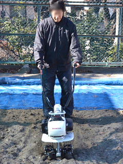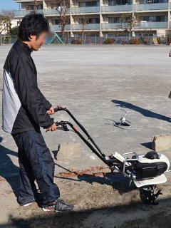 今年度の予算で購入した「耕耘機(こううんき)」の試運転をしました。プール南側にある学校園(栽培活動用の畑)で使うために買った物です。ガスのカセットボンベで動きます。この日は砂場で使ってみました。畑を耕すのに大活躍しそうです。
