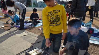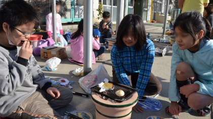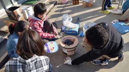 14日土曜授業日、4年生が昔の道具の学習で、七輪を使って餅などを焼いて食べる経験をしました。グループに1個の七輪で炭をおこし、持ち寄った餅や芋などを焼いて食べました。炭をおこすのに苦労したグループもありましたが、最後はどの班も真っ赤に焼ける炭で、熱々のお餅などを美味しそうに食べていました。