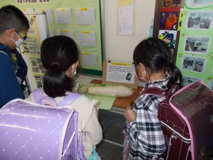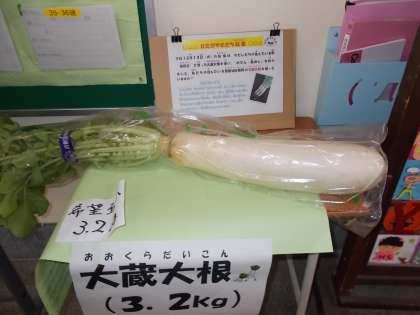 今日の給食用に届いた大蔵大根を、中央昇降口に展示しています。子どもたちはその大きさにびっくり。郷土、世田谷区を見直す機会となりました。