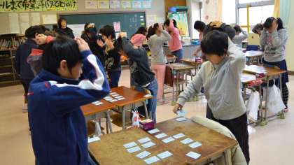 20日(金)、学校公開2日目、1・2時間目に3・4年生が合同で百人一首大会を行いました。3つのクラスに分かれて、頭の上に手を置く特別ルールで机の上に並んだ札を取り合いました。実はこれ、教科「日本語」の学習です。みんなよく覚えていました。