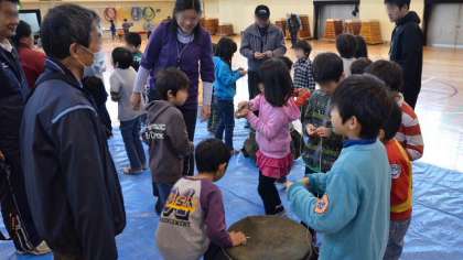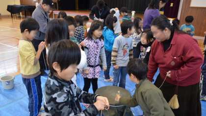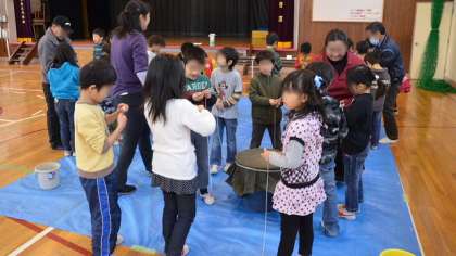 23日(月)は学校公開週間3日目。1・2年生が1・2時間目に生活科・日本語の授業として、昔遊びを習いました。「かがやく目」の会の皆さんにおいでいただき、今日はベーゴマと紙玉鉄砲(空気でっぽう)の遊び方を習いました。写真はベーゴマのようすです。道具を用意していただき、ていねいに教えてもらいましたが、これがかんたんそうでなかなか難しい。昨年も教わった2年生は少しできる子がいました。