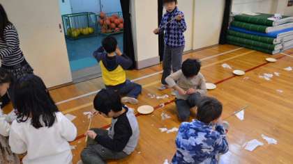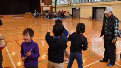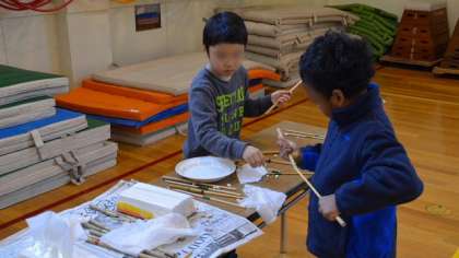 こちらの写真は紙玉鉄砲のようすです。細い竹筒と押し棒をお借りして、ティッシュペーパーを水で濡らして筒の両端に詰め準備完了。これも簡単そうで難しい。それでもこちらは次々とできる子が増えて、「ポン」という音と共に10m以上飛ばす子が出てきました。