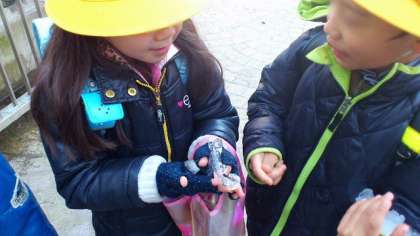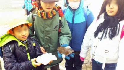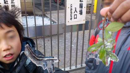 昨日の雪が残り、ぐっと冷え込んだ25日朝。登校してくる子どもたちが次々と発見した「もの」をお土産にもってきます。「先生先生、すごいよ見て見て!」と大騒ぎです。手には霜柱やつららが。中には植物が閉じ込められたつららも。確かにこれは大発見です。担任の先生や友達に見せるのだそうです。どの子もみんなうれしそうです。