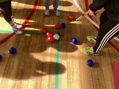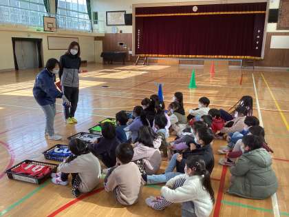初めて取り組む子が多く、ボールを持った時に「重たい!」「どうやったら白いボールに近づけるんだろう」と不安そうでしたが、いざゲームをやって見ると味方からのアドバイスを貰ったり、相手チームの投げ方を参考にしたりして楽しそうに取り組んでいました。試合を重ねていくうちに接戦が多く見られました。パラリンピックで行われている「ボッチャ」に親しむことが出来た時間でした。