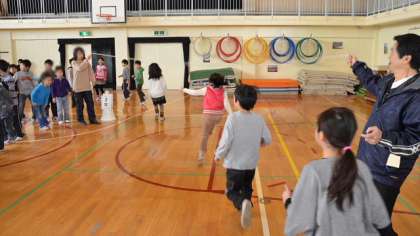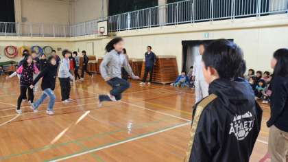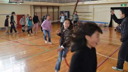 2回にわけて行い、最初は1・2・3年と4年1組が行い、次が4年2組、5・6年が競い合いました。回し手のハンデがついていて、1・2年は先生2人。3・4年は一人が先生。5・6年が子どもだけで回します。どの子も本気モード、3分間の熱い戦いです。見ている方も思わず引き込まれます。