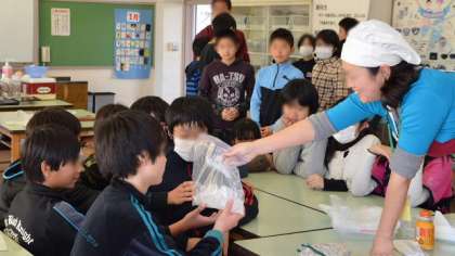 27日(金)、6年生の家庭科の授業で、食育に関する学習を、アイスクリーム会社の方を講師にお招きして行いました。最初にアイスクリームについての基礎的な知識をクイズ形式で学習。次に、簡単な作り方を紹介してもらい、実際に作って、できあがったアイスクリームを試食してみて、家にある道具で手軽に作れることに子どもたちはびっくりでした。