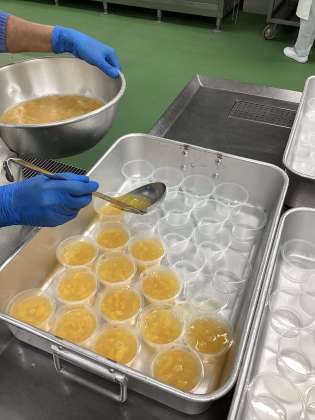 今日は、もものゼリーです。桜桃を細かく刻んだ物をゼリー液に入れて作りました。全校分で600個くらいを一つ一つ手作りしています。