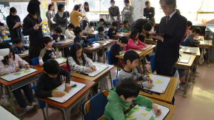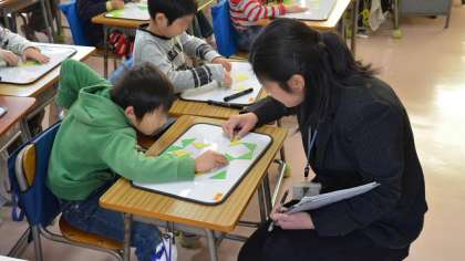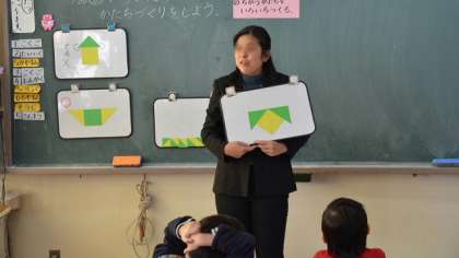 30日(月)の午後、1年生の算数研究授業を行いました。今日の学習は「かたち」。二等辺三角形(内角が45度と90度)を4つ組み合わせて、図形をつくる授業です。一人一人にミニホワイトボードをわたし、マグネット付きの三角形を組み合わせて、いろいろな形をつくりました。