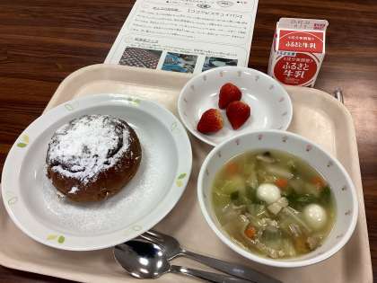 2月14日は、日頃お世話になっている方や、ちょっと気になるあの子へ、それぞれの思いで贈り物を贈るバレンタインの日ですね。今日は給食からみんなに、1日前ですが「ココアマフィン」を贈ります。今日のビスキュイパンは、パンをココアパンにしています。バター・卵・小麦粉を混ぜたクッキー生地をパンにのせて焼き上げました。クッキー生地にも「ココア」を合わせています。甘い香りのビスキュイパンを味わってください。