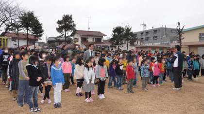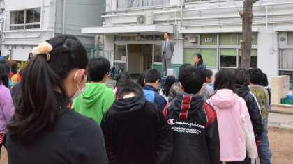 6日(月)の朝会は校庭で行いました。今日は、気温はあまり低くないものの曇り空。日の光が当たらない分寒く感じましたが、みんなコートを脱いで集合。よい姿勢で話を聞くことができ、さすが希望っ子たちというところです。校長講話では、スキージャンプ女子で大活躍の中学生、高梨沙羅選手について紹介しました。