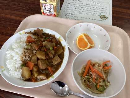 こんにゃくはカロリーが低く、腹持ちがよいことから、こんにゃくは多くのダイエット食品に使用されています。昔から「胃のほうき」と呼ばれ、体の中をきれいにしてくれます。こんにゃくには食物繊維や骨や歯を強くするカルシウムが含まれています。今日はサラダに入っています。よく噛んで食べてくださいね。