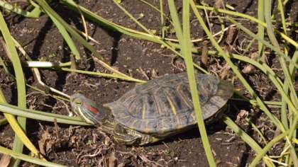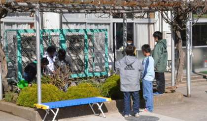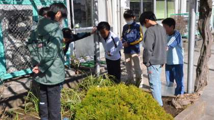 9日の昼休みのようすです。4年生の男の子たちが所員室前の花壇のところで、教室で飼育しているカメの散歩をさせていました。暖かい日差しをあびてカメも気持ちよさそう。元気に歩き回っていました。暖かい教室の窓辺で飼育しているので、冬でも冬眠しないのですね。子どもたちも楽しそうにカメの周りに集まっていました。