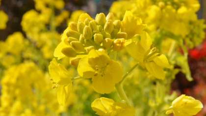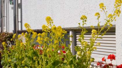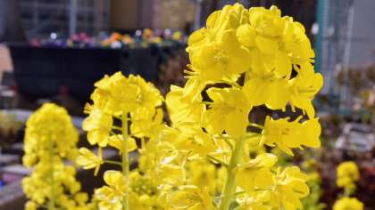 校舎の南側、中央階段のところの花壇のようすです。冬の間は風あたりが弱く、日差しが存分に差し込むこの花壇は、もう春の雰囲気です。菜の花の黄色が鮮やかです。
