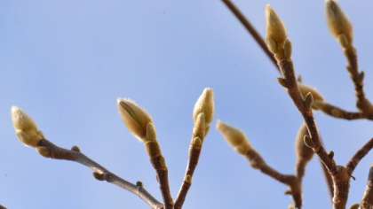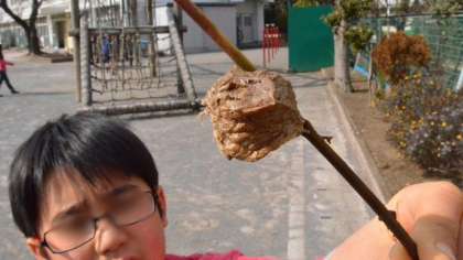 学校の身近な自然のようすを紹介します。上はハクモクレンのつぼみです。だいぶふくらんできました。真ん中の写真は芝生の上で何かをついばんでいるムクドリです。いったい何を食べているのでしょうか? そして最後の写真はカマキリの卵塊です。見つけた子が得意そうに見せてくれました。