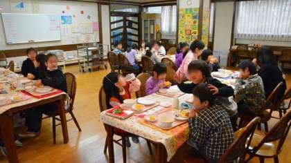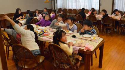 14日のランチルーム給食は3年生です。今日のメニューはフィッシュサンド(白身魚フライのサンド)、ミネストローネスープ、オレンジ、牛乳でした。食器がランチルーム専用で、部屋の雰囲気も教室とはずいぶんちがうので、楽しく食事できるのですね。