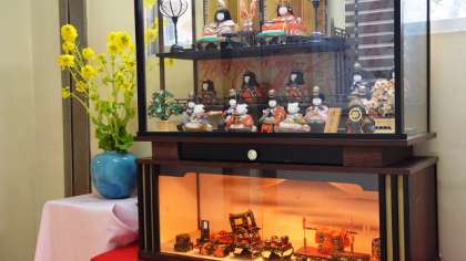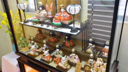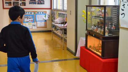 14日、今日、学校主事が玄関横の廊下にひな人形をかざりつけました。天気はどんよりした1日でしたが、この周りだけは華やかな春の雰囲気です。