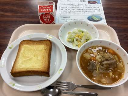 ボルシチは、ロシアの伝統料理です。肉と野菜を煮込んだスープで、きれいな赤い色を出すために「ビーツ」という野菜を入れて作ります。給食では、トマトケチャップを使いました。ロシアはとても寒い国で、その厳しい寒さに耐えるために、肉や野菜をたくさん食べて栄養を摂り、体を温める工夫をしています。