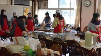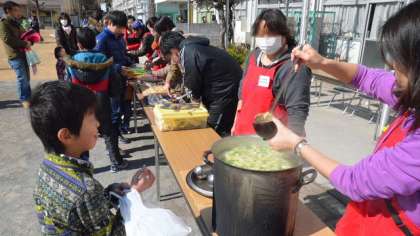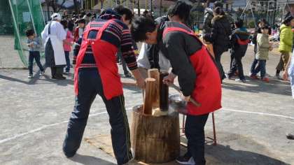遊び場開放委員会の皆さんの奮闘ぶりです。おかげさまで、あんこやあべかわ、ごまやのり、そしてダイコンおろしのおいしいお餅ができあがりました。熱々の豚汁もふるまわれました。