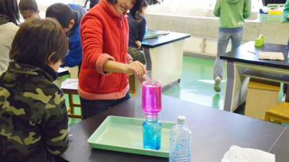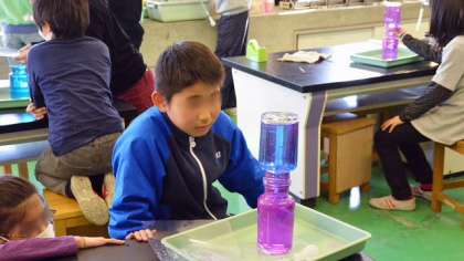 これは、科学・工作クラブの後半のようすです。2本のビンの片方には冷たい水(青)を、片方にはお湯(赤)を入れて、二つのビンをピッタリ上下に合わせます。上がお湯の時は混じり合わないのに、逆にするとあっという間に混じり合って色が紫になりました。みんな不思議がいっぱいで、楽しく活動できました。