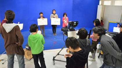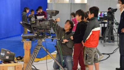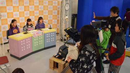 基本を習った後は、番組制作に取りかかります。みんなで考えた台本に従って、入念な練習とチェックをします。キャスターやリポーター、ディレクターのように華やかな役の子だけでなく、技術やプロンプターの裏方になった子も、本物のスタッフの熱心な指導で真剣に一体感をもって取り組んでいました。
