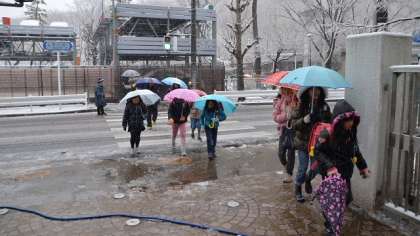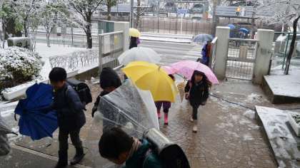 29日、いつもより早めに子どもたちが登校してきました。朝早く状況を緊急メールで流していたので、長靴やスノーブーツを履いてくる子が多くいたので、この後に雪が降り続いても大丈夫かなと安心することができました。