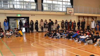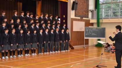 美しい声、力強い声が体育館に響き渡ります。子どもたちや参観に訪れた保護者の方々が真剣に聞き入っています。歌が終わると大きな拍手がわき起こりました。