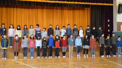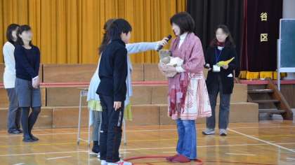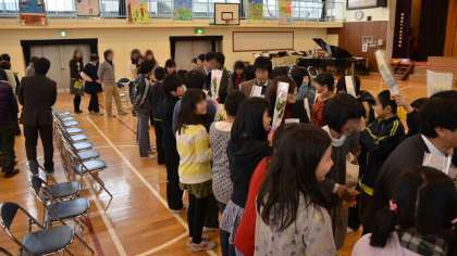 合奏に続いて合唱。美しい歌声を響かせてくれました。その後、保護者の方の企画による「親子の絆」を確かめるセレモニーを行いました。子どもたちが自分が誕生したときの体重とほぼ同じ重さのテディーベアを親に手渡し、感謝の言葉を述べ、親からも一言。中には思わず声がつまってしまう方も。最後は、6年生と保護者の皆さんがつくるアーチをくぐり花をうけとり職員が退場。冬の雨で冷え込んだ体育館でしたが、心温まるひとときをすごすことができました。