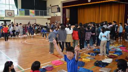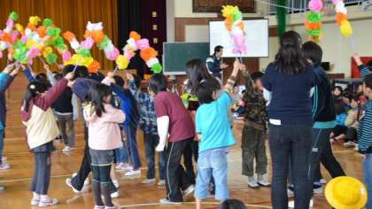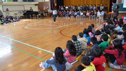 6日(火)3・4時間目。児童会主催による「6年生を送る会」を体育館で行いました。児童会運営委員が司会進行をつとめ、1年生がつくった花のアーチの間を通って6年生が入場。最初はみんなでイントロ○×クイズで楽しみました。曲は6年生の好きな歌から選びました。
