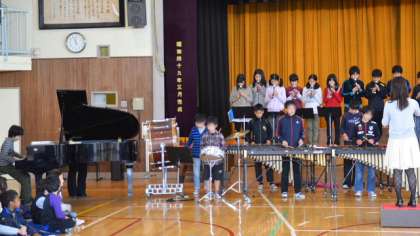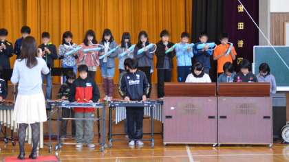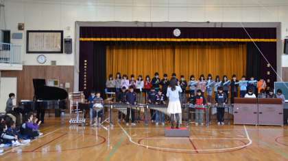 1〜5年生の感謝の言葉に応えて、6年生がこれまで一生懸命練習してきた合奏を披露。さすが6年生。みんなの目は真剣に演奏する6年生に集中です。終了と同時に大きな拍手が。