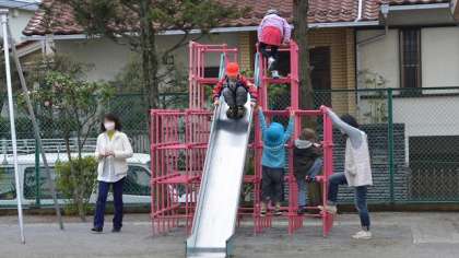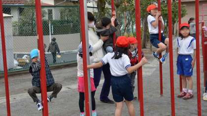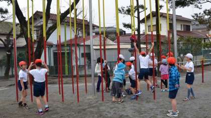 8日午前、近隣の「ひだまり保育園」を今年度卒園する子供たちが、本校を訪れ、学校の様子を見学しました。1年生の体育の時間にまじって、一緒に昇り棒に他やレンジしているようすです。来年度本校に入学する園児もいました。よろしくね。
