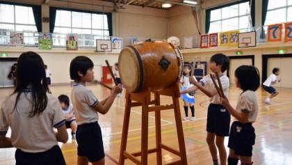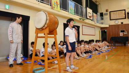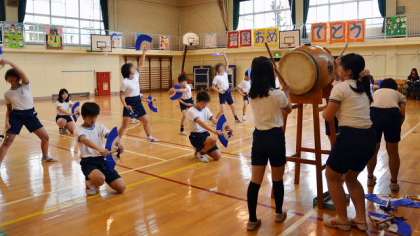 6年生は太鼓も見事です。ここまで、本当によくがんばりました。続いて、6年生から励ましの言葉を5年生に送り、いよいよ5年生が踊ります。引き継いだ技の披露です。