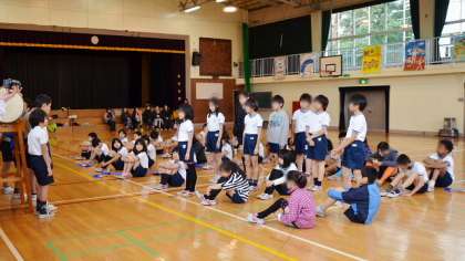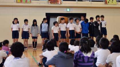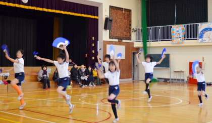 6年生にはかなわないかもしれませんが、5年生も少ない人数でしっかりと太鼓をたたき、軽快に踊ることができました。最後に5・6年生がむきあって、引き継ぎの言葉を述べ、みかぐらリーダーもバトンタッチされ、希望っ子の伝統が引き継がれました。