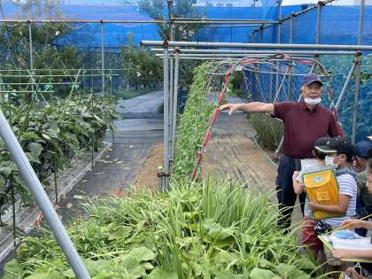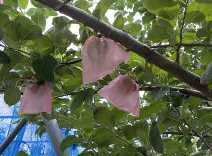 地域のりんご園に行きました。春に見学したときには、りんごの実は小さく、なかなか見付けることはできませんでしたが、今回は袋をかけた中に薄っすらと大きくなったりんごの実を見付けることができて、みんな興奮していました。社会科の授業では、農家の仕事の学習をしています。果樹園にも夏野菜を栽培している畑があり、栽培の工夫や大変さについても教えていただくことができました。