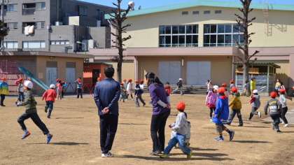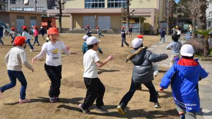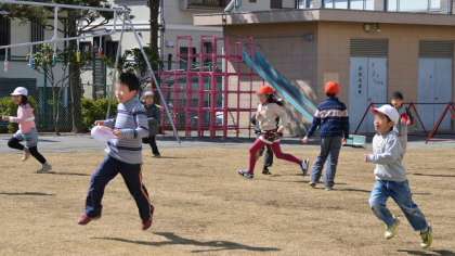 13日(火)の中休み、毎週恒例となった1・2年合同遊びのようすです。担任が見守る中、今日はみんなで鬼ごっこです。自分たちで相談して決めた鬼が赤帽子、逃げる方は白帽子です。つかまったところで赤帽子に変えて、みんなを追いかけます。芝生の上を全力疾走。元気な1・2年生です。