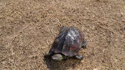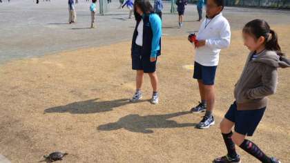 15日(木)の昼休み。4年1組で飼育しているカメの散歩風景です。思ったよりもすばやく動くカメに子どもたちは大喜び。