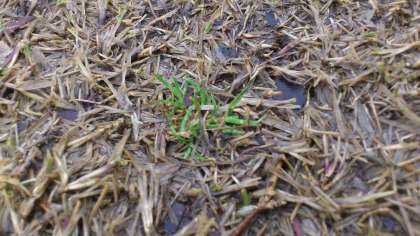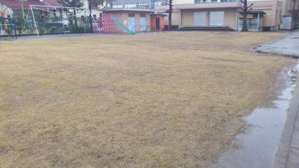 雨が降ってどんよりとした天候の日が続いていますが、確かな春の足音が聞こえてきます。雨上がりにふと校庭の芝生に目をやると、緑色に…。近付いて見るとあちこちから芝の新しい葉が出てきています。全体が緑にもどるのも近いのでしょうか?