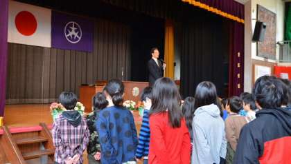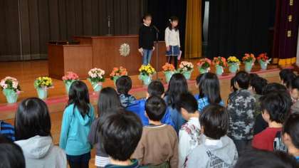 22日(木)朝、卒業式の飾り付けができた体育館で、修了式を行いました。始めに修了証を各クラスの代表に渡し、続いて児童代表の言葉です。今日は1年生と5年生が行いました。この1年を振り返り、来年度への抱負を述べ、それぞれその学年らしい内容で立派でした。校長講話では、この1年の成長を語り、それを支えてくれた家族や学校職員、そして先輩に、このような機会に感謝の言葉を述べるように言いました。最後に職員と子どもたちが向き合い、副校長クイズ。そして最後に互いにあいさつをして修了式を終わりました。