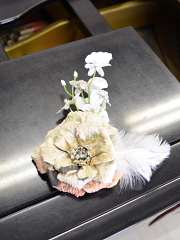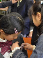 23日は卒業式。開式の前、9時30分に集まった卒業生と在校生代表の4・5年生は音楽室で最後の発声練習を行い、その後、6年生保護者が自作したコサージュを、5年生が卒業生の胸に付けました。